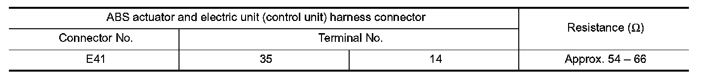2. Check the resistance between the ABS actuator and electric unit (control unit) harness connector terminals.