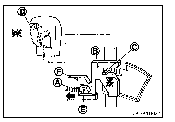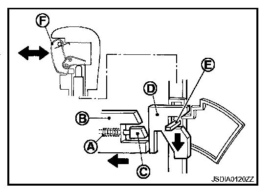 The lock plate (B) lowers according to the downward movement of the position pin (C) when the selector button (D) is pressed, and presses only slider B (E) into the shift lock unit. Slider A (F) located below the lock plate prevents the downward movement of the lock plate with the spring force. The selector lever cannot be shifted from the "P" position for this reason.