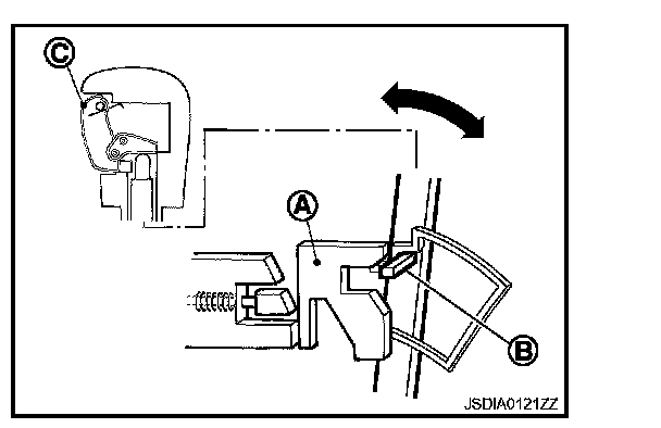 The shift lock solenoid (A) inside the shift lock unit is energized and the relative positions of sliders A (B) and B (C) are maintained when the brake pedal is depressed while the ignition switch is ON.