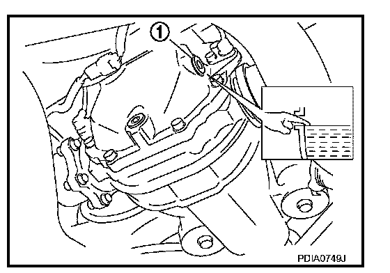 - Remove filler plug (1) and check oil level from filler plug mounting hole as shown in the figure.
