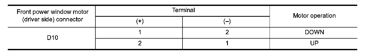 3. Check motor operation by connecting the battery voltage directly to front power window motor (driver side) terminals.