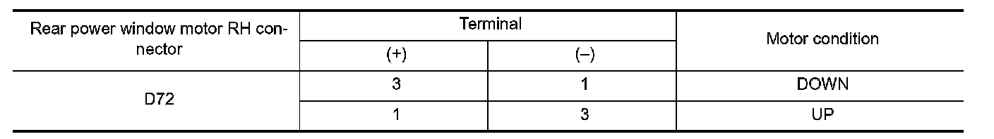 3. Check motor operation by connecting the battery voltage directly to rear power window motor RH terminals.