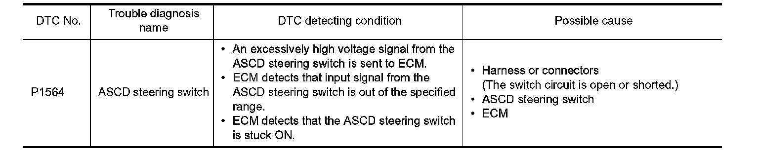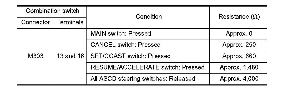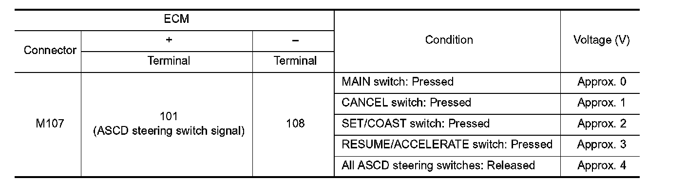 ASCD steering switch has variant values of electrical resistance for each button. ECM reads voltage variation of switch, and determines which button is operated. Refer to System Description for the ASCD function.