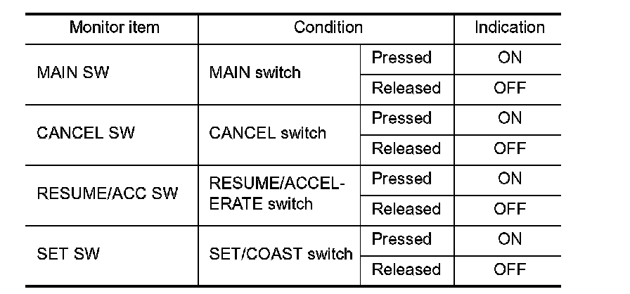 2. Select "MAIN SW", "CANCEL SW", "RESUME/ACC SW" and "SET SW" in "DATA MONITOR" mode with