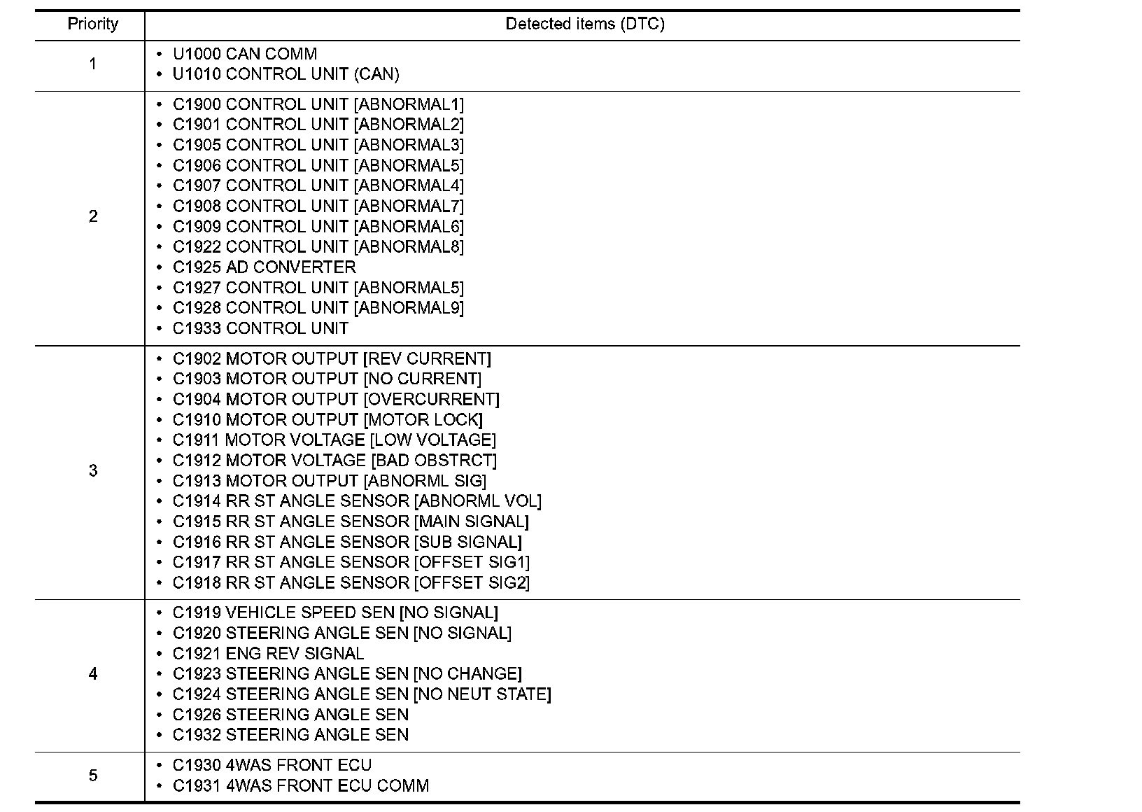 If some DTCs are displayed at the same time, perform inspections one by one based on the following priority chart.