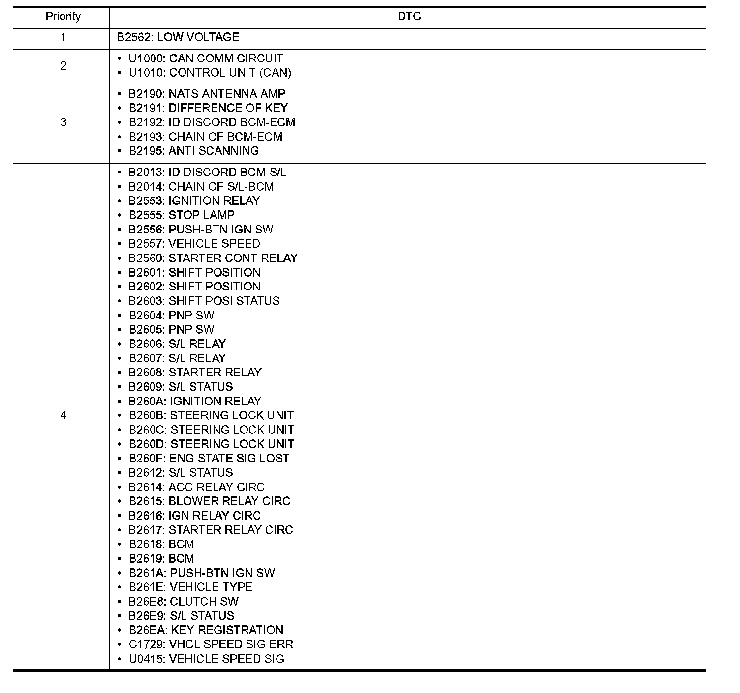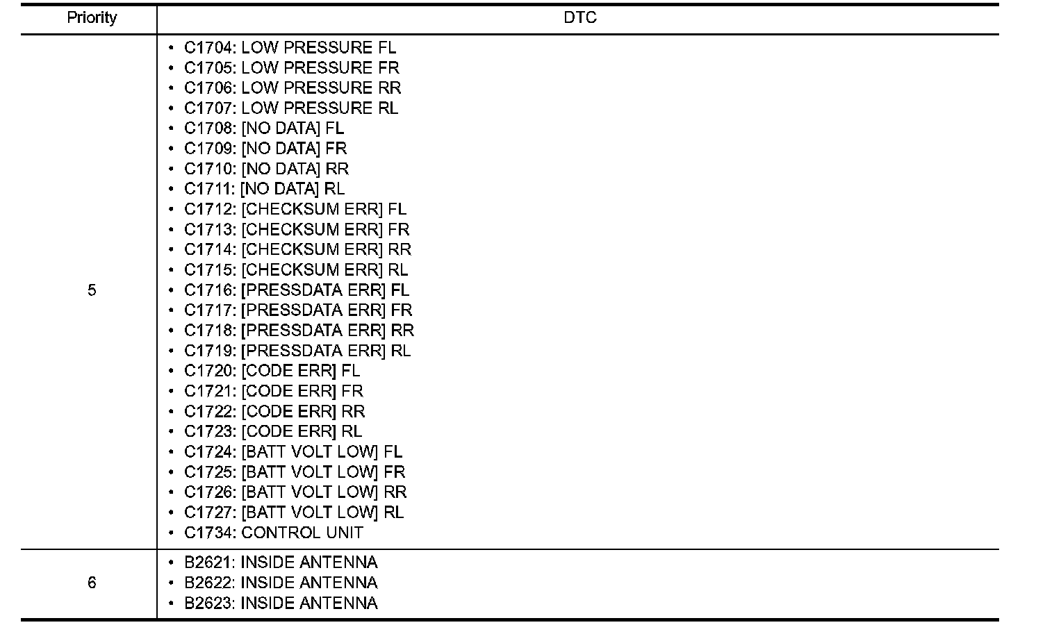 If some DTCs are displayed at the same time, perform inspections one by one based on the following priority chart.