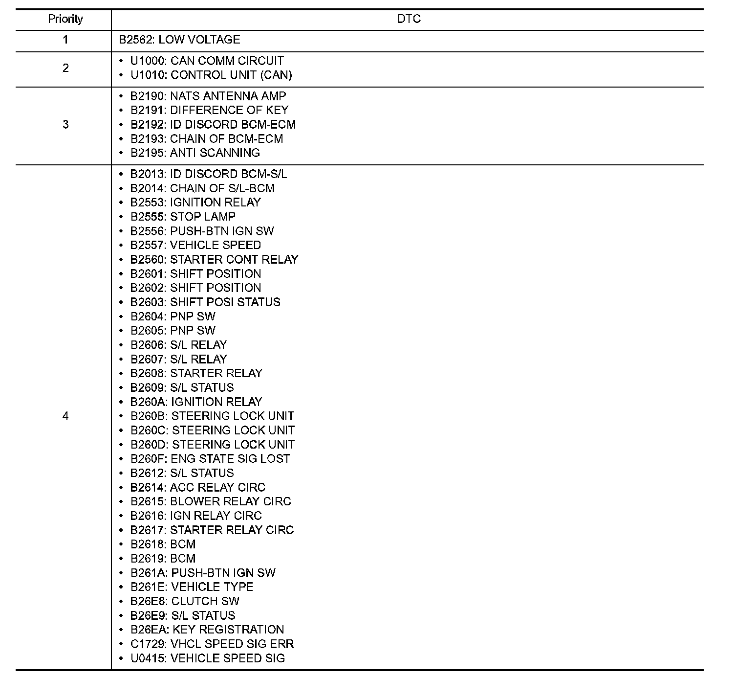 If some DTCs are displayed at the same time, perform inspections one by one based on the following priority chart.