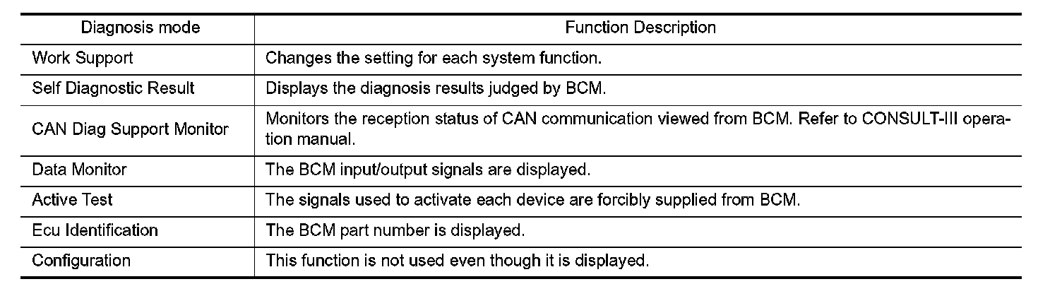 CONSULT-III performs the following functions via CAN communication with BCM.