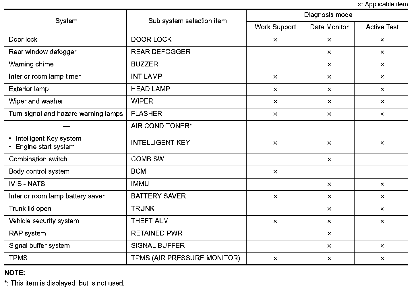It can perform the diagnosis modes except the following for all sub system selection items.