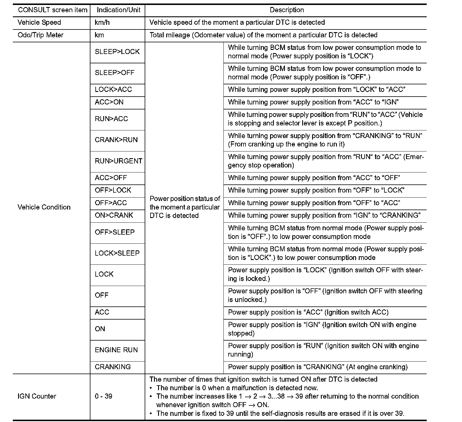 The BCM records the following vehicle condition at the time a particular DTC is detected, and displays on