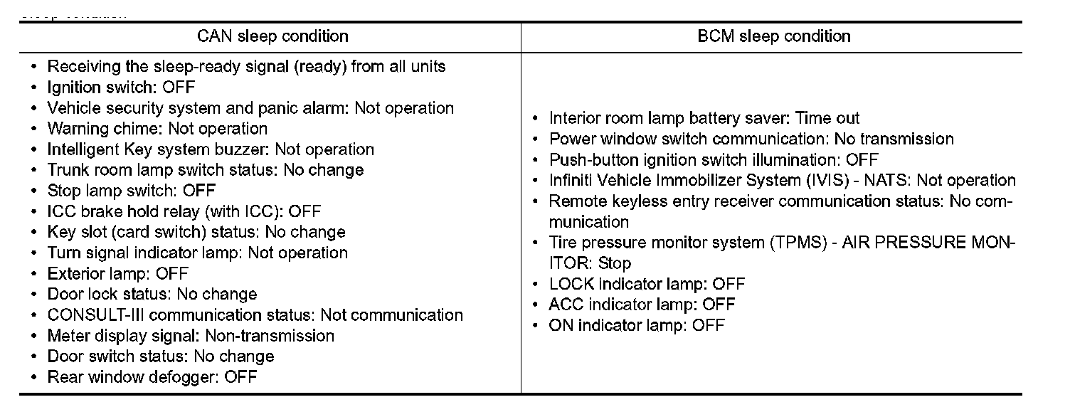 - BCM transmits the sleep wake up signal (sleep) to each unit when all of the CAN sleep conditions are fulfilled.