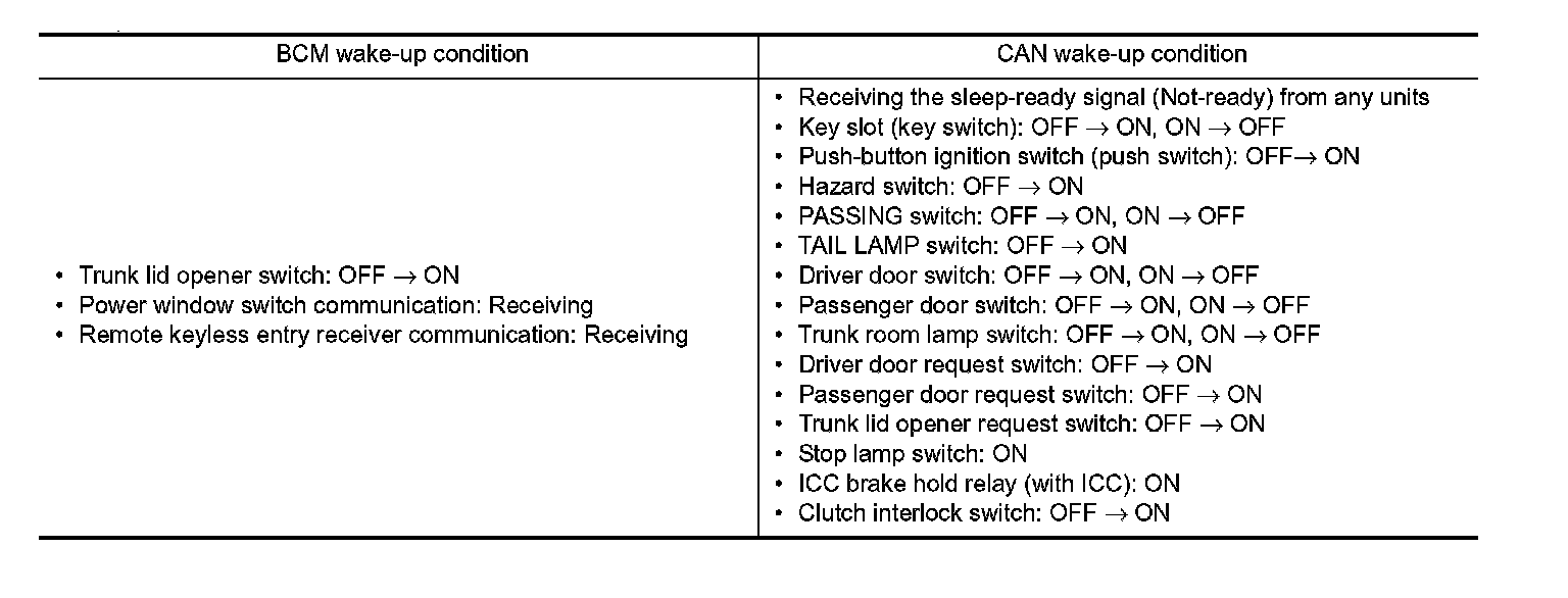 - BCM transmits the sleep wake up signal (wake up) to each unit when any of the CAN wake-up conditions is fulfilled. It changes from the low power consumption mode or the CAN communication sleep mode to the normal mode.