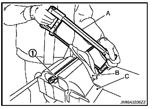- When cutting a hole on trunk lid stay, always cover a hacksaw using a shop cloth (B) to avoid scattering metal fragments or oil.