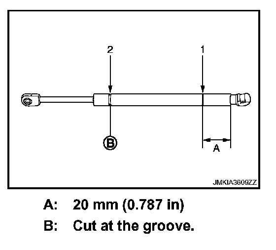 2. Using hacksaw (A) slowly make 2 holes in the trunk lid stay, in numerical order as shown in the figure.
