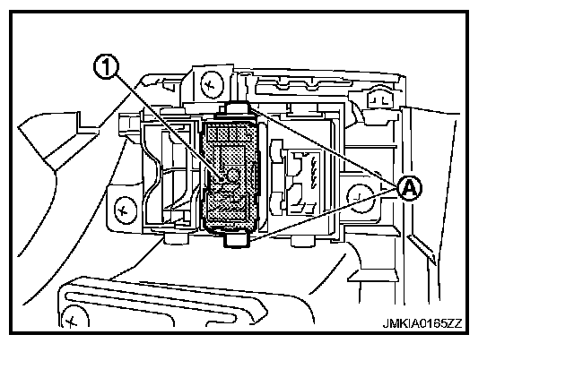 2. Remove the trunk lid opener switch (1) from instrument driver lower panel, and then remove pawl (A). Press trunk lid opener switch (1) front side to disengage from instrument driver lower panel.