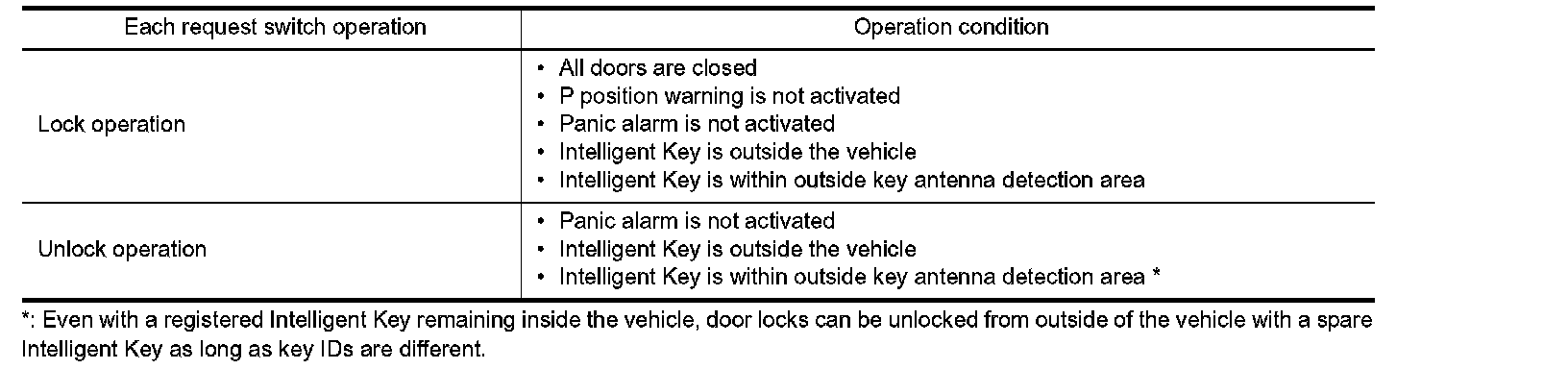 When all doors are locked, ignition switch is in the OFF position and key switch is OFF (Intelligent Key is not inserted in key slot), doors are unlocked with door request switch