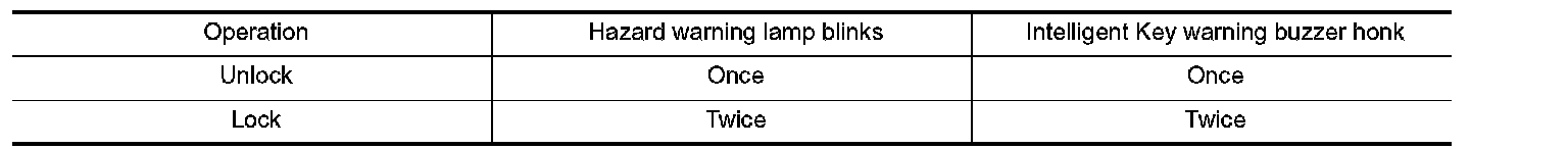 During lock, unlock, operation by each request switch, the hazard warning lamps and Intelligent Key warning buzzer blinks or honks as a reminder.