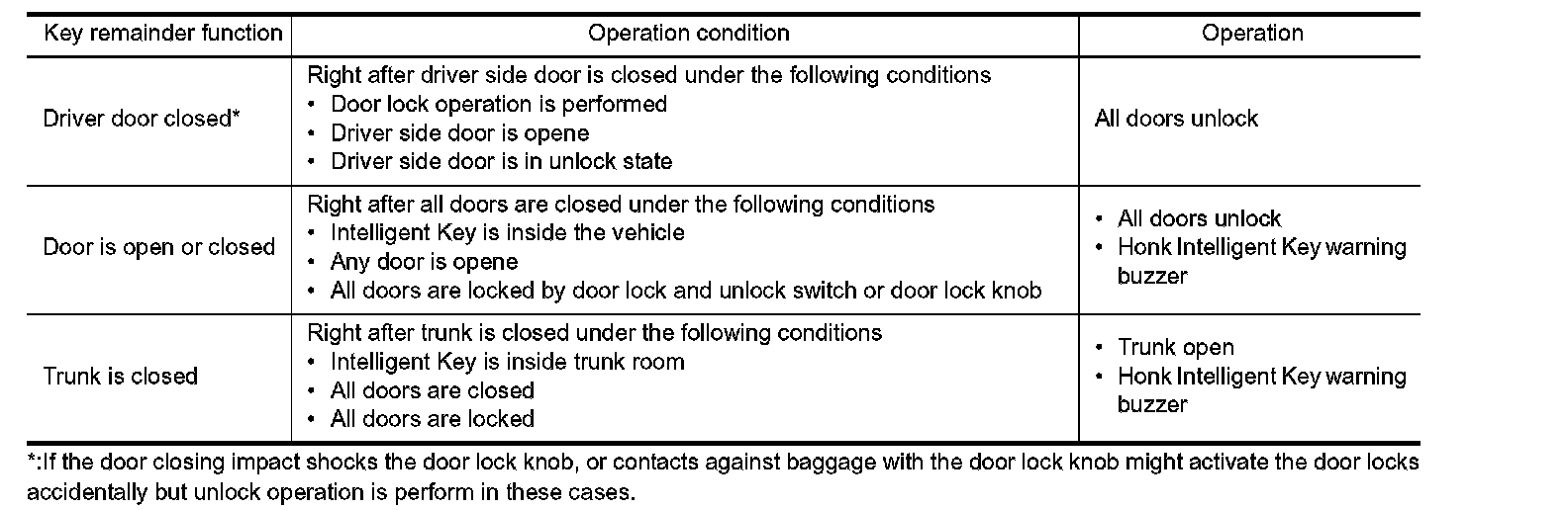 - The above function operates when the Intelligent Key is inside the vehicle. However, there may be times when the Intelligent Key cannot be detected, and this function does operate when the Intelligent Key is on the instrument panel, rear parcel shelf, or in the glove box. Also, this system sometimes does not operate if the Intelligent Key is in the door pocket for the open door.