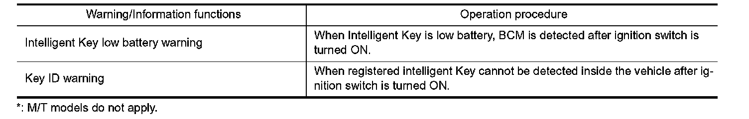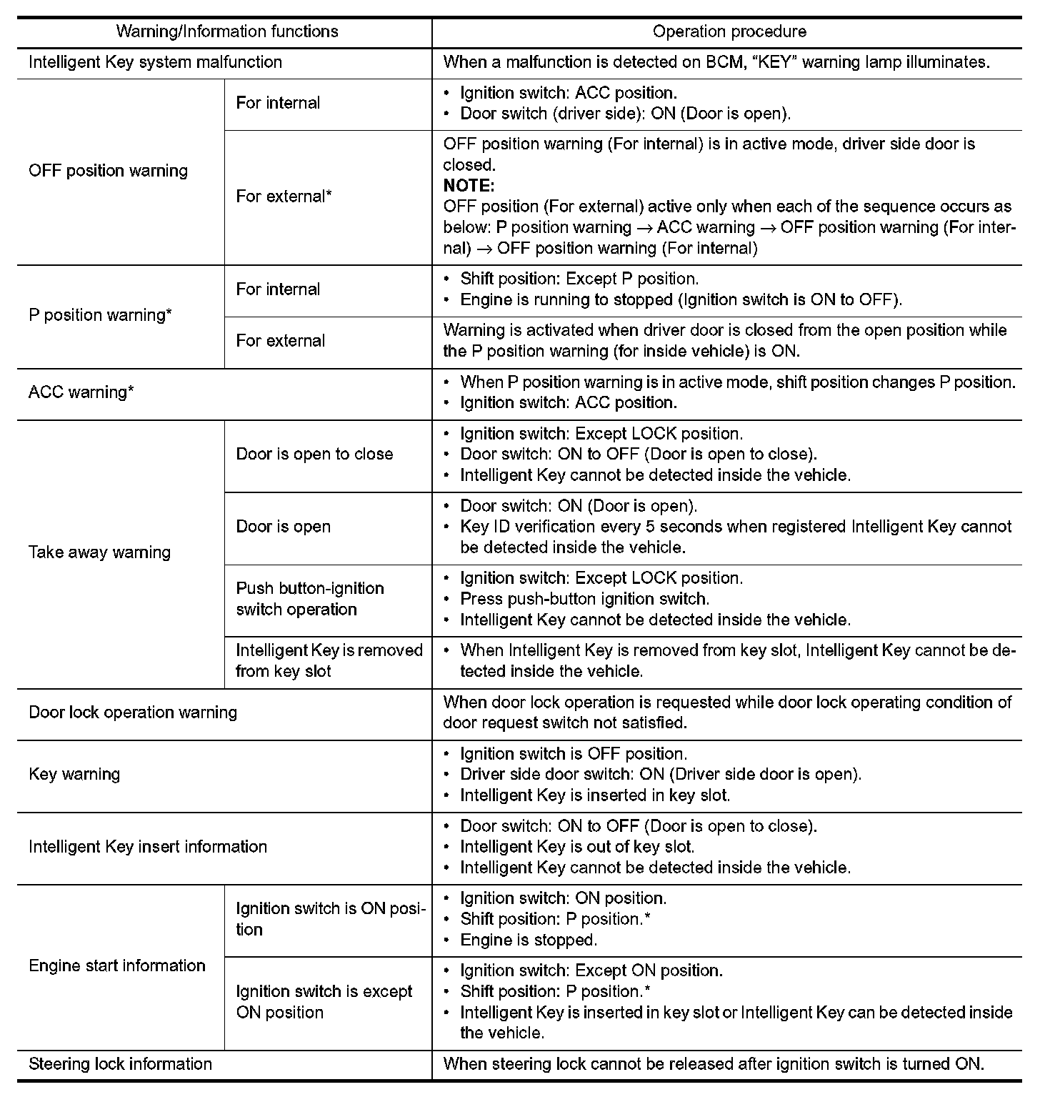 The warning function are as per the following items and are given to the user as warning information and warnings using combinations of Intelligent Key warning buzzer, KEY warning lamp, key slot indicator and information display in combination meter.