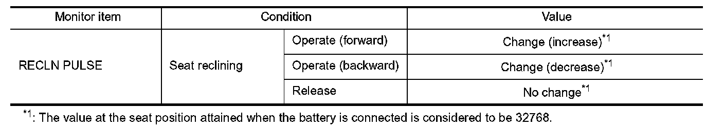 3. Check reclining sensor signal under the following conditions.