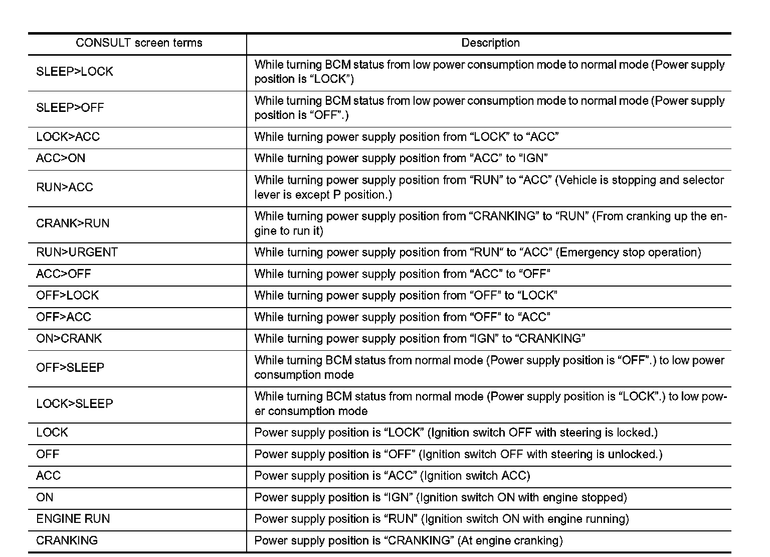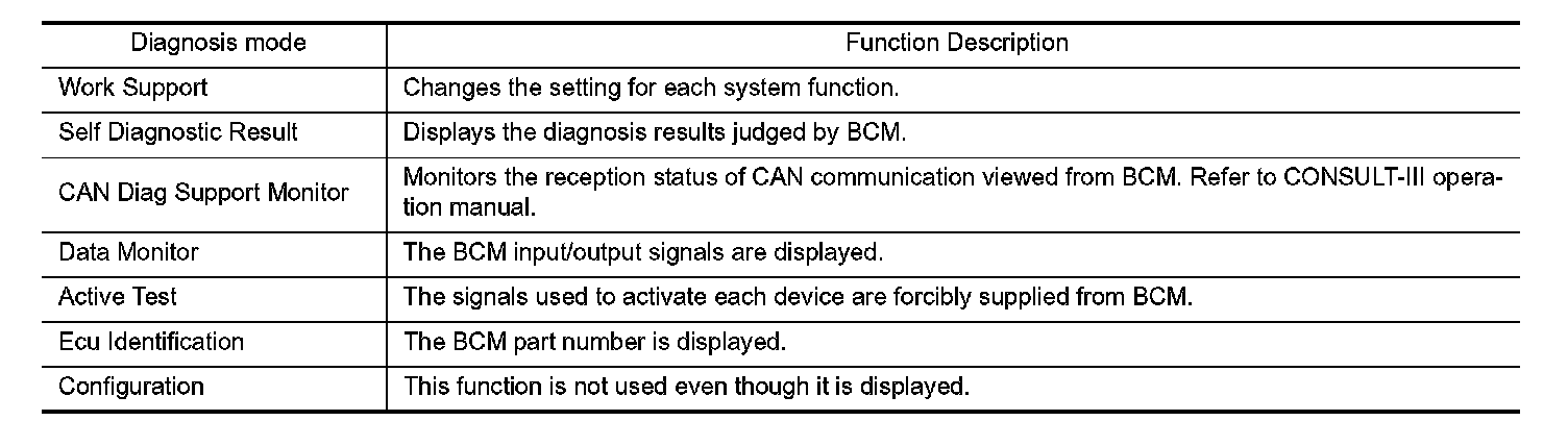 CONSULT-III performs the following functions via CAN communication with BCM.