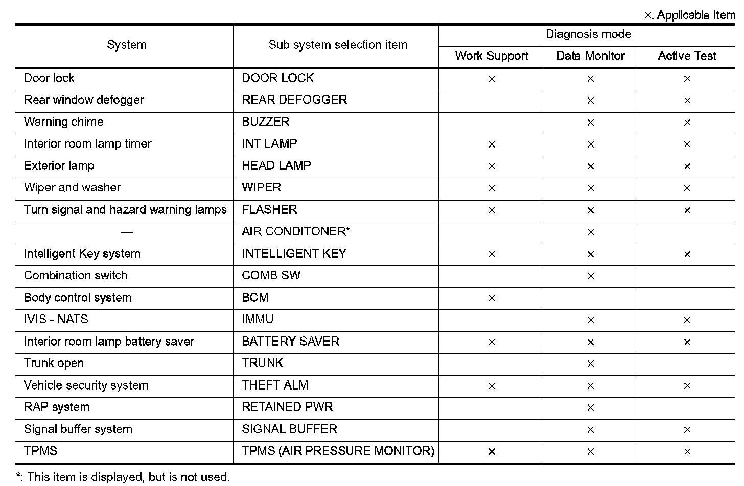 It can perform the diagnosis modes except the following for all sub system selection items.