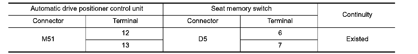 3. Check continuity between automatic drive positioner control unit harness connector and seat memory switch harness connector.