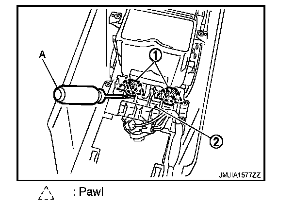 2. Remove heated seat switch (1) from switch bracket (2) with flat bladed screwdriver (A).
