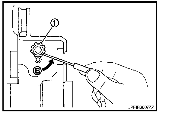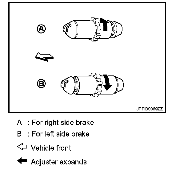 b. Using suitable tool, rotate adjuster (1) in the direction (B) to retract and loosen brake shoe.