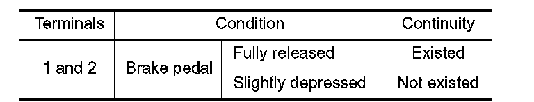 2. Check the continuity between ICC brake switch terminals under the following conditions.