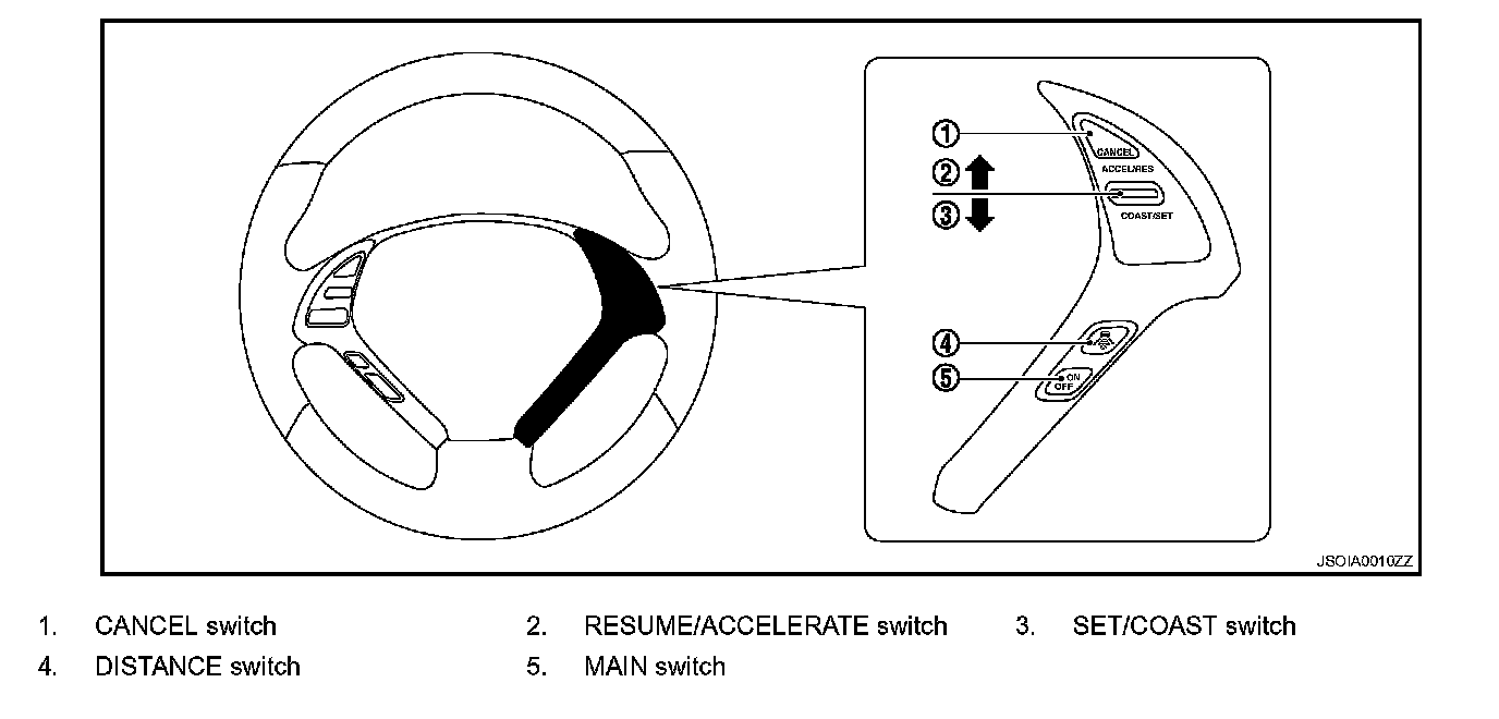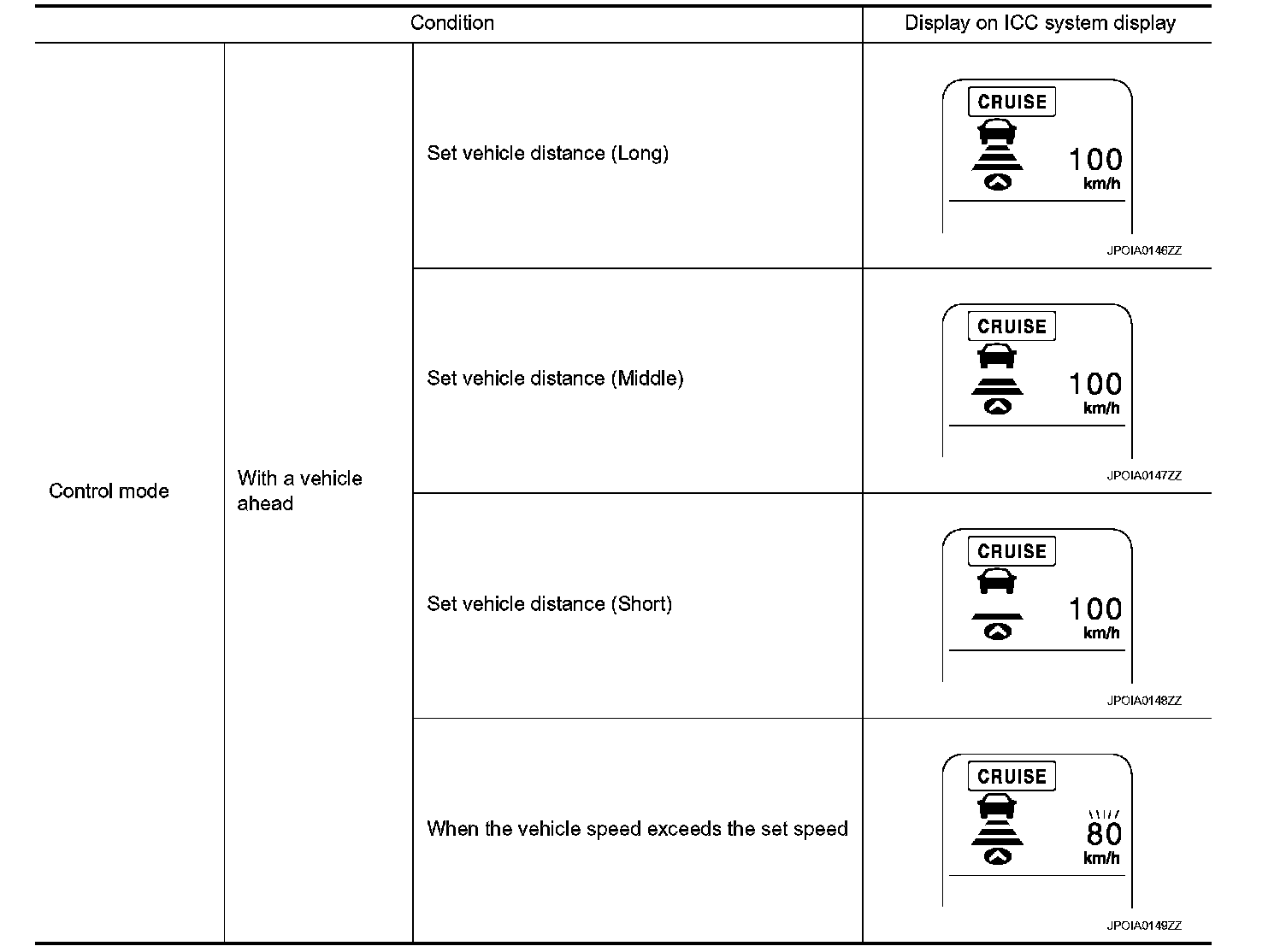 - When there is a vehicle traveling ahead, the vehicle-to-vehicle distance control mode adjusts the speed to maintain the distance, selected by driver, from a vehicle ahead. The adjusting speed range is between approximately 32 km/h (20 MPH) and up to the set speed.