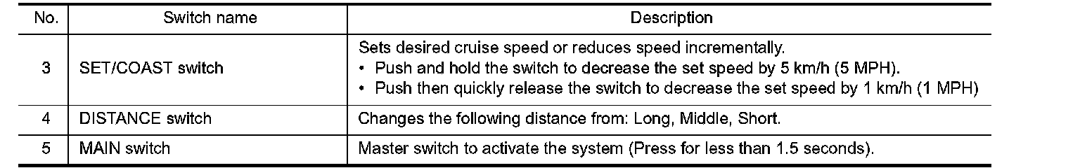 - When the SET/COAST switch is pushed under the following conditions, the system cannot be set. A warning chime will sound and the set speed indicator and own vehicle indicator will blink.