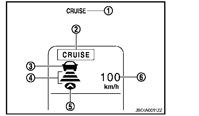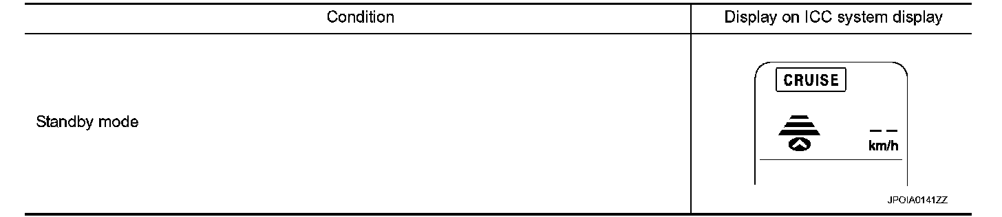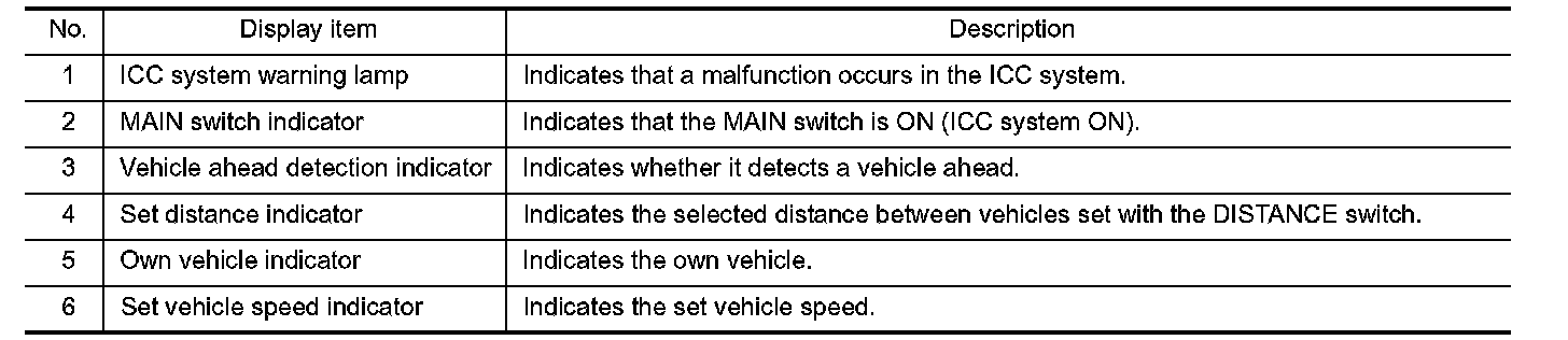 The MAIN switch indicator (cruise indicator), set distance indicator, own vehicle indicator, and set vehicle speed indicator come on and ICC system is set to a standby state.