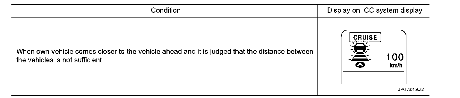 If own vehicle comes closer to a vehicle ahead due to rapid deceleration of that vehicle or if another vehicle cuts in, the system warns the driver with the chime and ICC system display. Decelerate by depressing the brake pedal to maintain a safe vehicle distance if:
