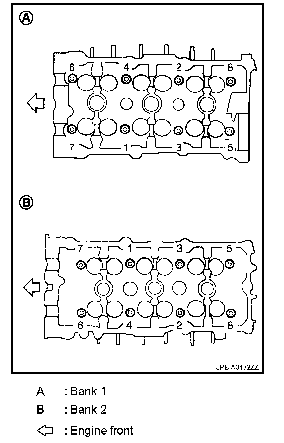 9. After installing cylinder head, measure distance between front end faces of cylinder block and cylinder head (bank 1 and bank