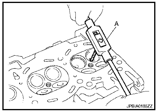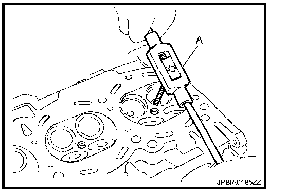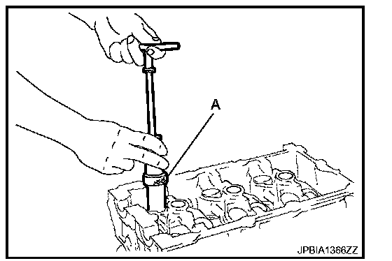 a. Using the valve guide reamer (commercial service tool) (A), ream cylinder head valve guide (EXH) hole.