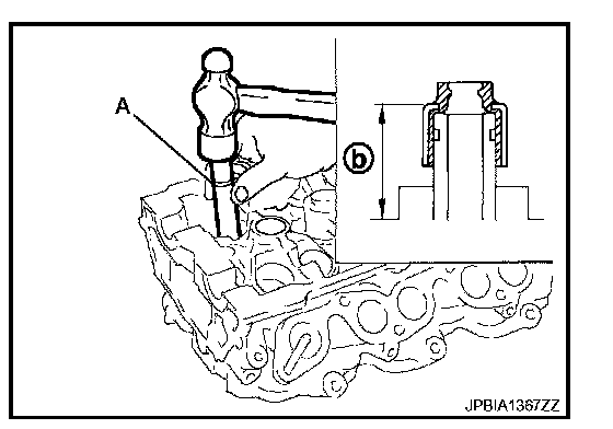 b. Using the valve oil seal drift [SST: KV10115600 (J-38958)] (A), press fit valve seal to height (b) shown in figure.
