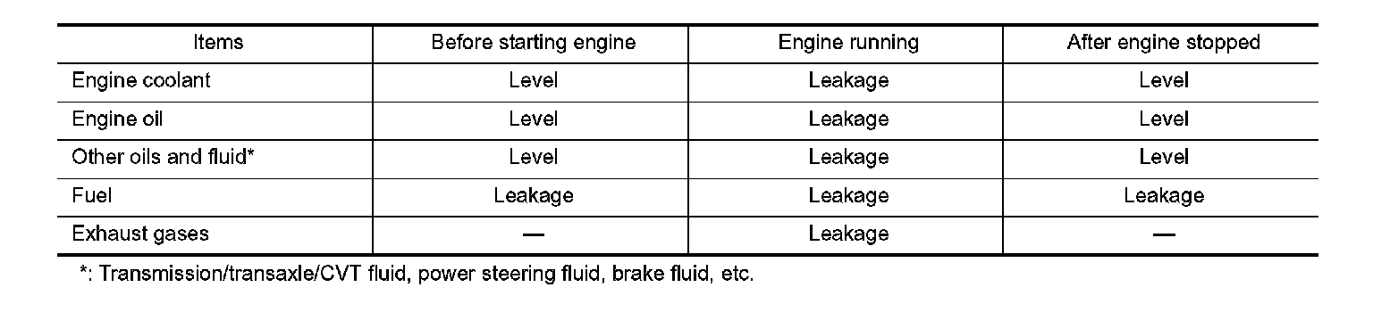 The following are procedures for checking fluids leak, lubricates leak and exhaust gases leak.