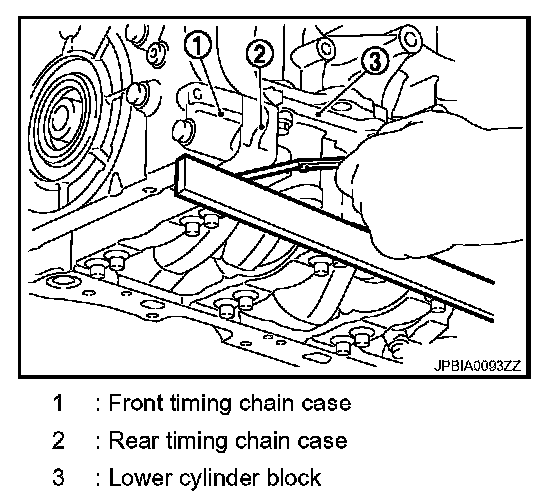 b. Cut liquid gasket using the seal cutter [SST: KV10111100 (J-37228)] and remove rear timing chain case.