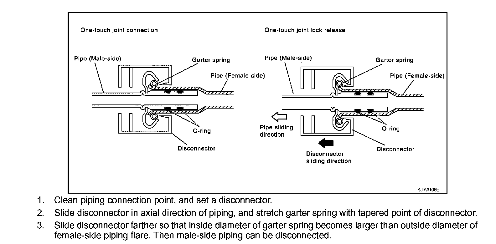 3. Slide disconnector farther so that inside diameter of garter spring becomes larger than outside diameter of female-side piping flare. Then male-side piping can be disconnected.