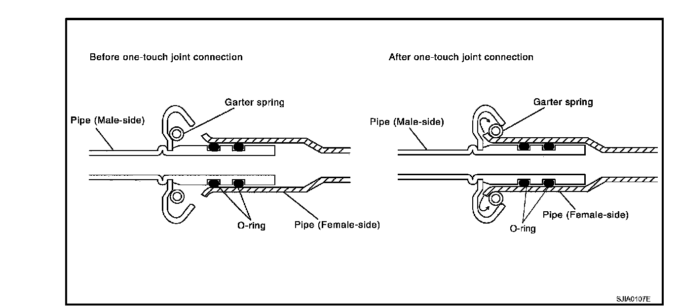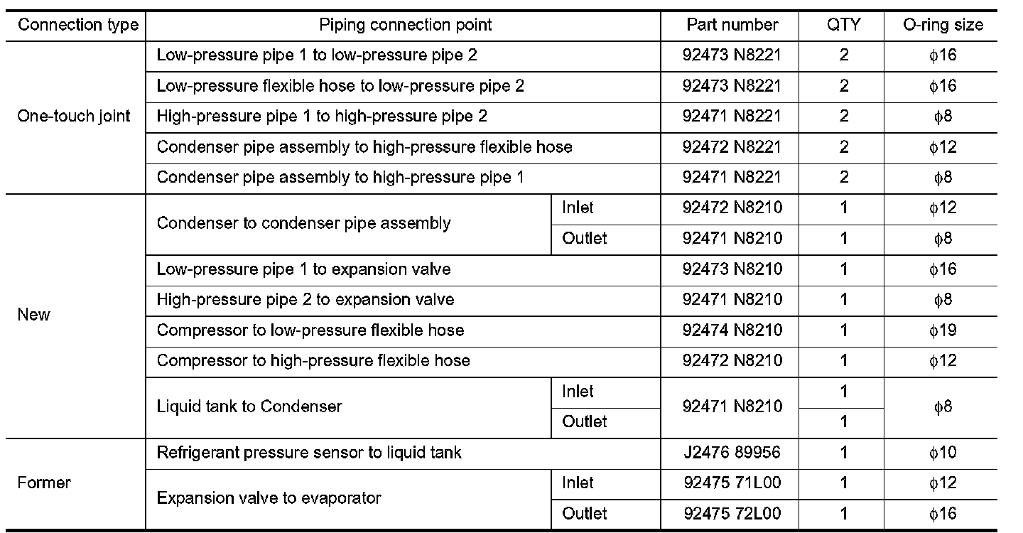 The new and former refrigerant connections use different O-ring configurations. Never confuse Orings since they are not interchangeable. Refrigerant may leak at the connection if a wrong O-ring is installed.