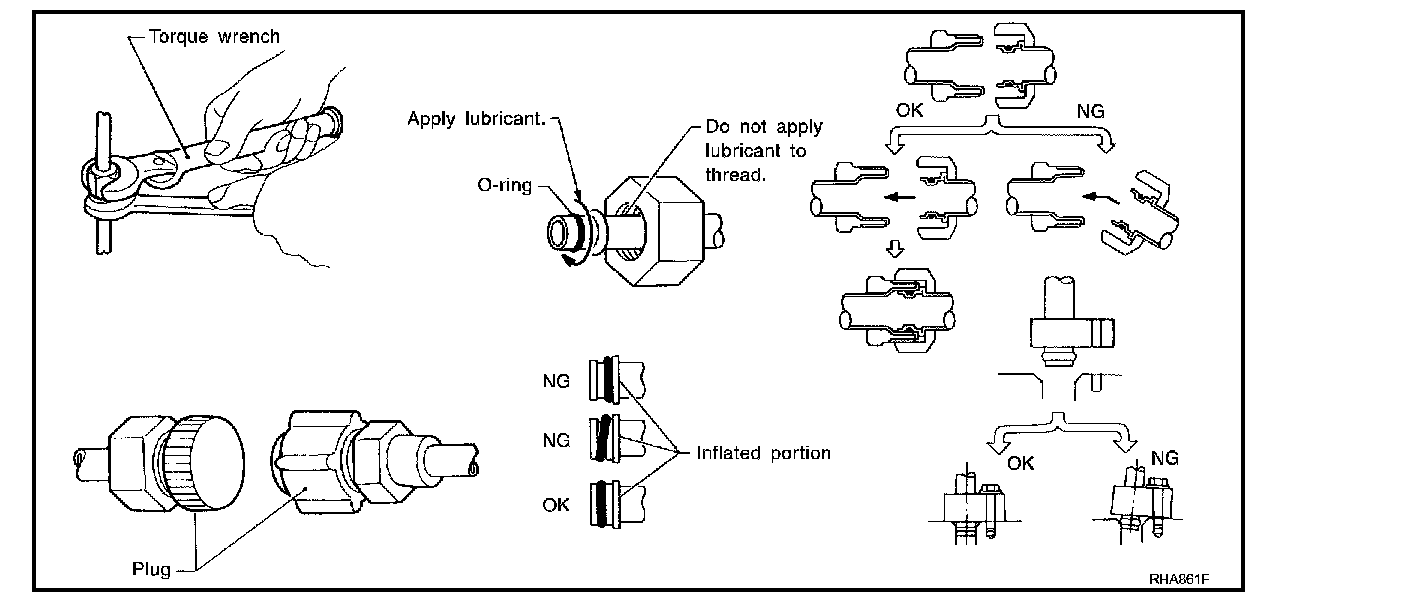 Disconnect that line and replace the O-ring when the refrigerant leaking point is found. Then tighten connections of seal seat to the specified torque.