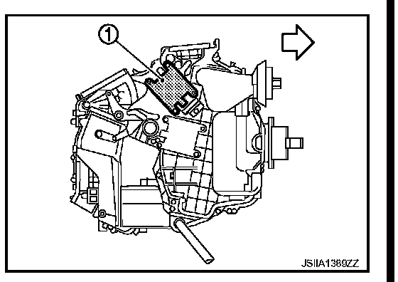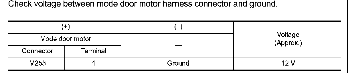 The mode door motor (1) is attached to the heater and cooling unit assembly. It rotates so that air is discharged from the outlet set by the unified meter and A/C amp. Motor rotation is conveyed to a link which activates the mode door.