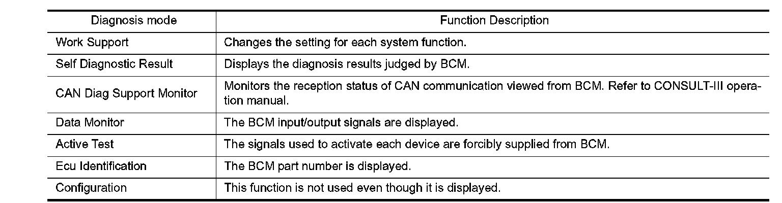 CONSULT-III performs the following functions via CAN communication with BCM.
