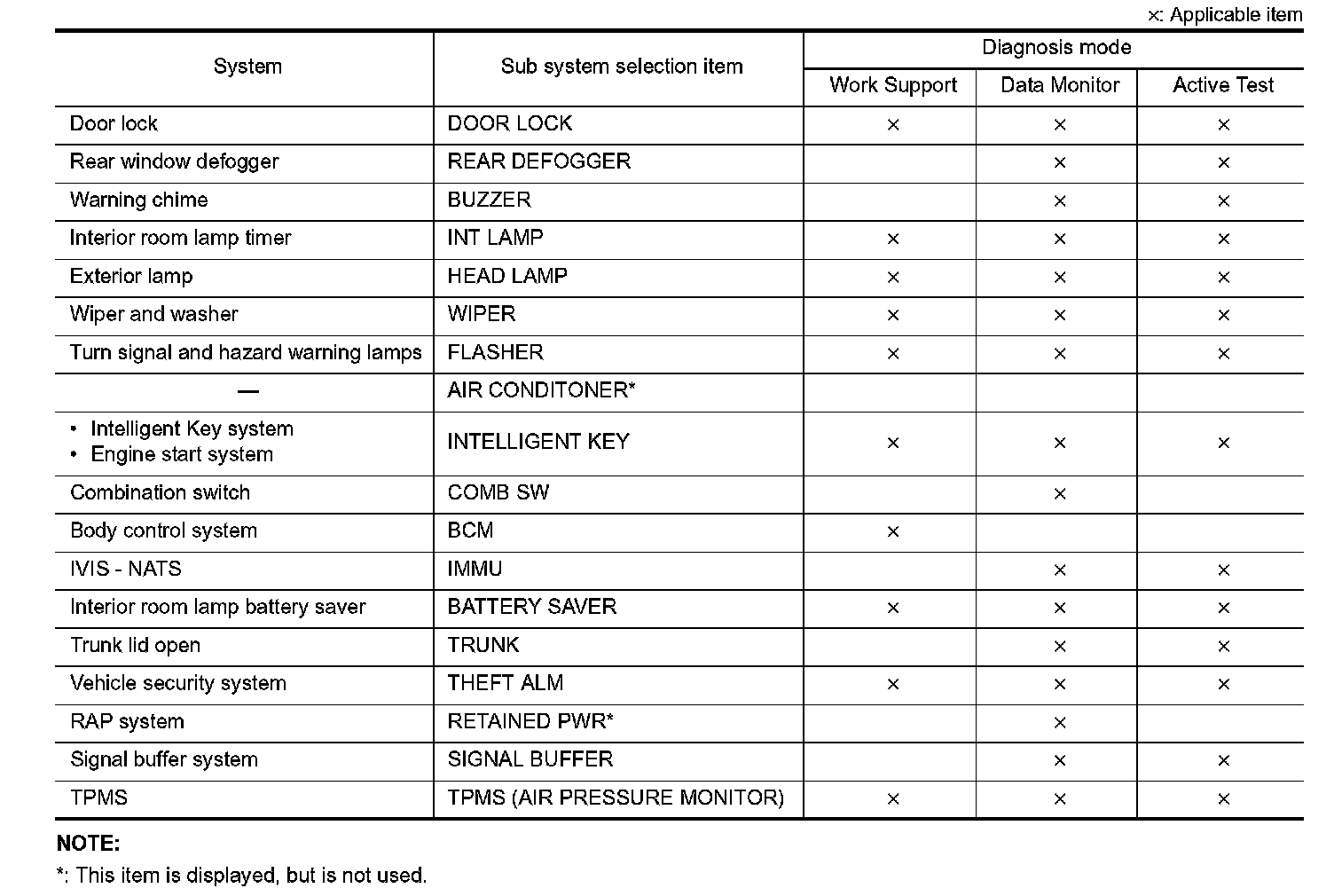 It can perform the diagnosis modes except the following for all sub system selection items.