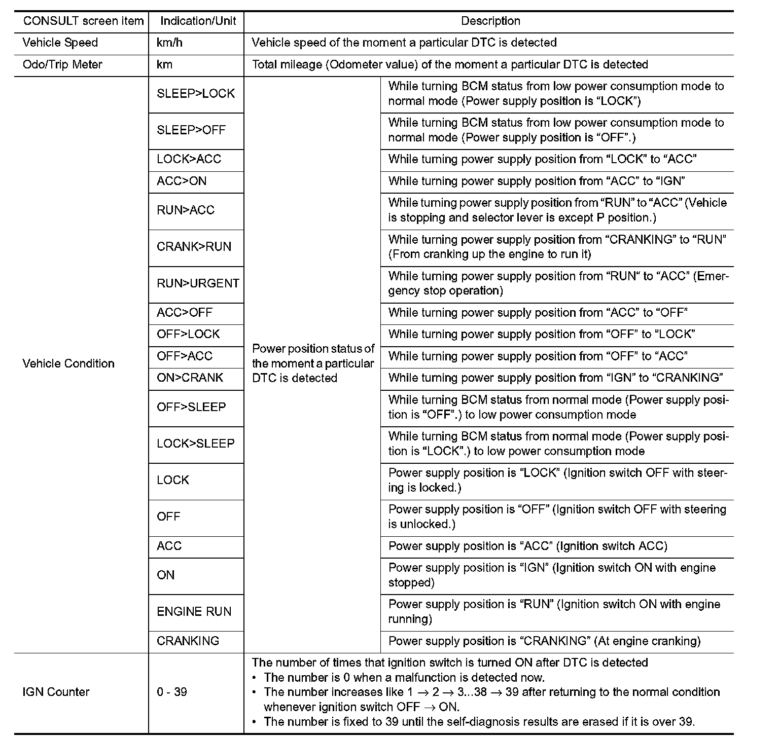 The BCM records the following vehicle condition at the time a particular DTC is detected, and displays on
