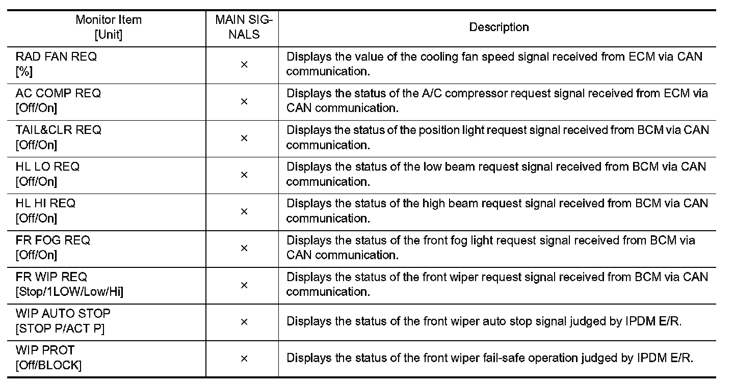 CONSULT-III performs the following functions via CAN communication with IPDM E/R.