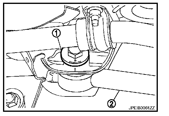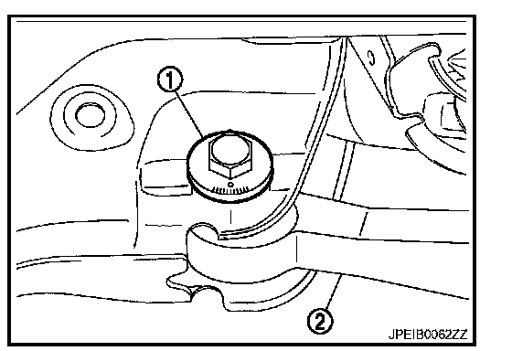 - If toe-in is not within the specification, adjust with adjusting bolt (1) in rear lower link (2).