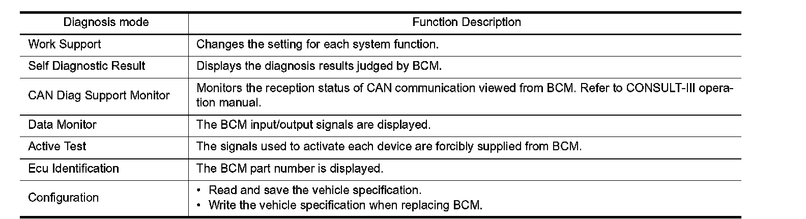 CONSULT-III performs the following functions via CAN communication with BCM.