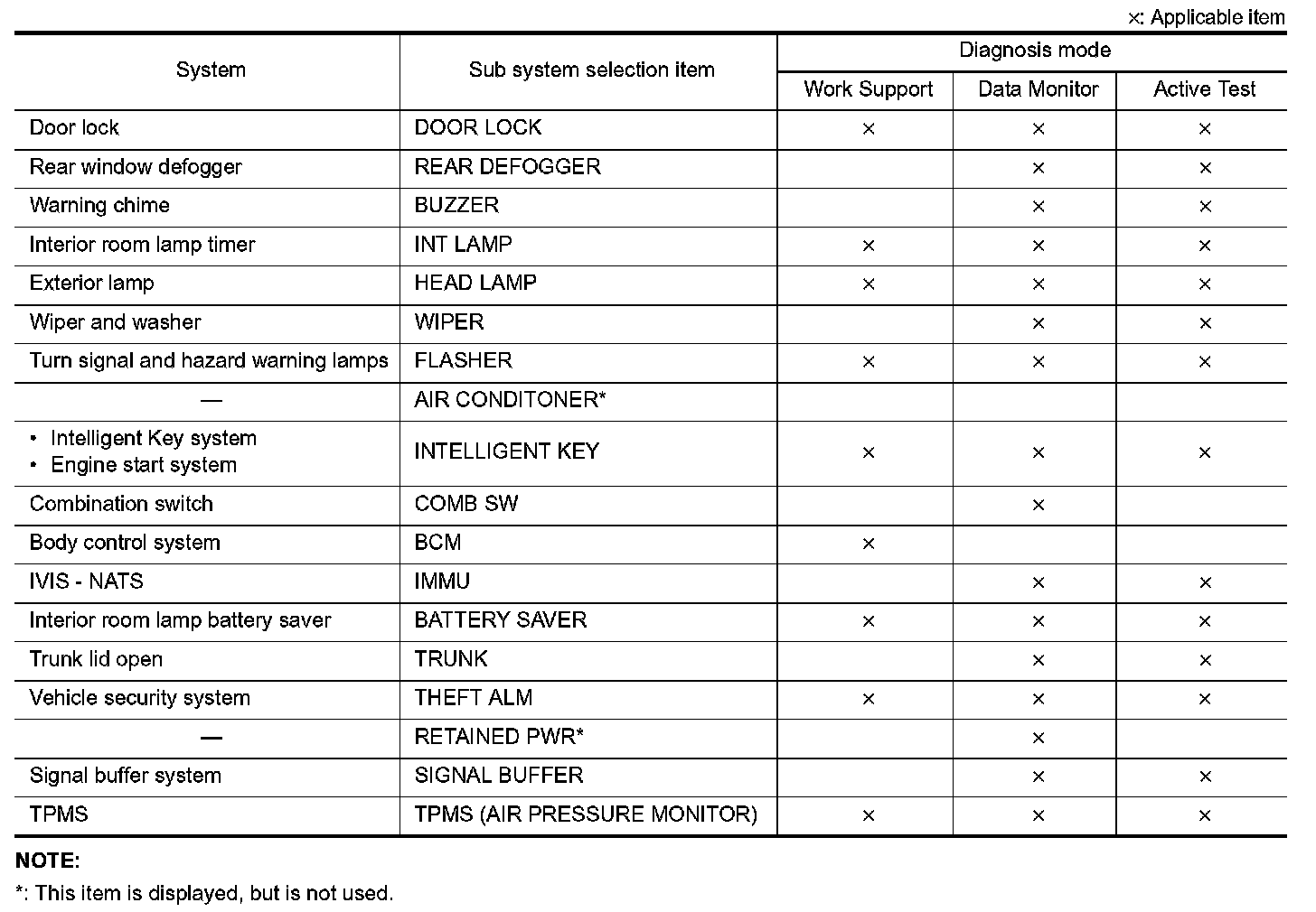 It can perform the diagnosis modes except the following for all sub system selection items.